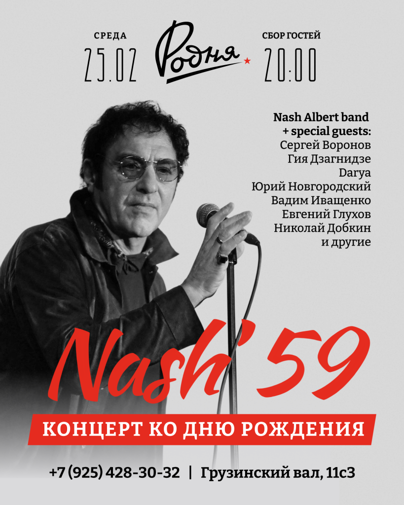 Концерт ко дню рождения Нэша Тавхелидзе. В тёплой атмосфере клуба «Родня» музыкант устроит настоящий праздник! В этот вечер на сцене будет группа именинника – Nash Albert Band и, конечно, множество специальных гостей: Сергей Воронов из группы The Crossroadz, вместе с которым у Нэша есть проект Voron&Nash, и недавно у музыкантов вышел сингл. А также будут: Юрий Новгородский, Darya, Вадим Иващенко, Николай Добкин и многие другие!